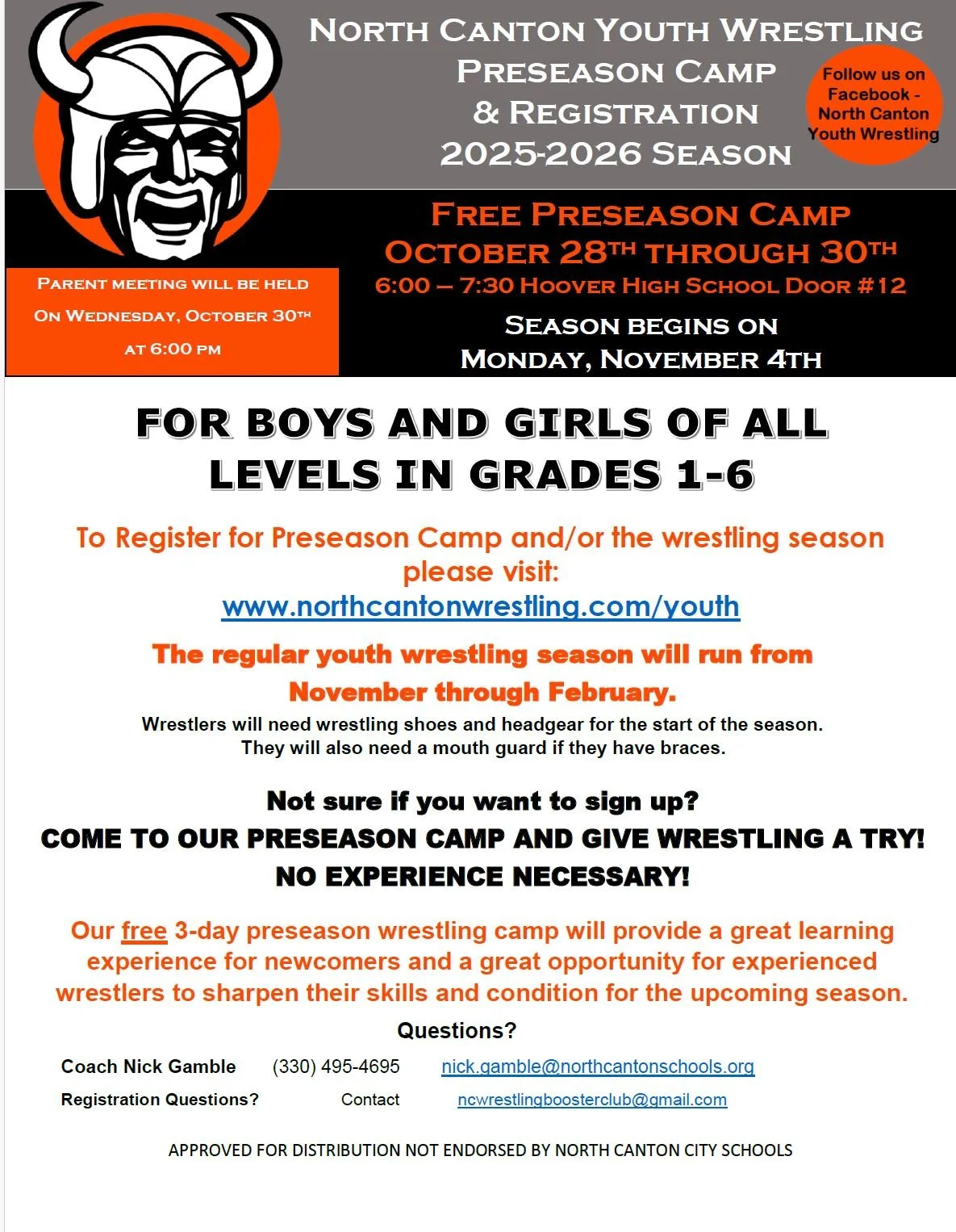 We are thrilled to announce that registrations are open for the North Canton Youth Wrestling Program! This exciting opportunity allows young enthusiasts to plunge into the world of wrestling, learning, growing, and competing in an environment filled with energy and passion. Our experienced coaches are eager to share their knowledge and skills, fostering a sense of discipline, teamwork, and sportsmanship among the participants. Spaces are limited, so don’t miss the chance to be part of this empowering journey. Secure a spot and let the young athletes experience the joy of wrestling, the support of the community, and the thrill of accomplishment!